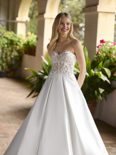 Robe princesse à grande silhouette de bal, en satin. Idéale pour les mariées recherchant opulence et présence imposante. coup de coeur des drôles de dames de l’émission “la robe de…