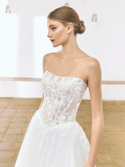 Cette robe de mariée classique est à la fois féminine et luxueuse, le corsage en transparence et la simplicité de la jupe en tulle mettront toutes les silhouettes en valeur….